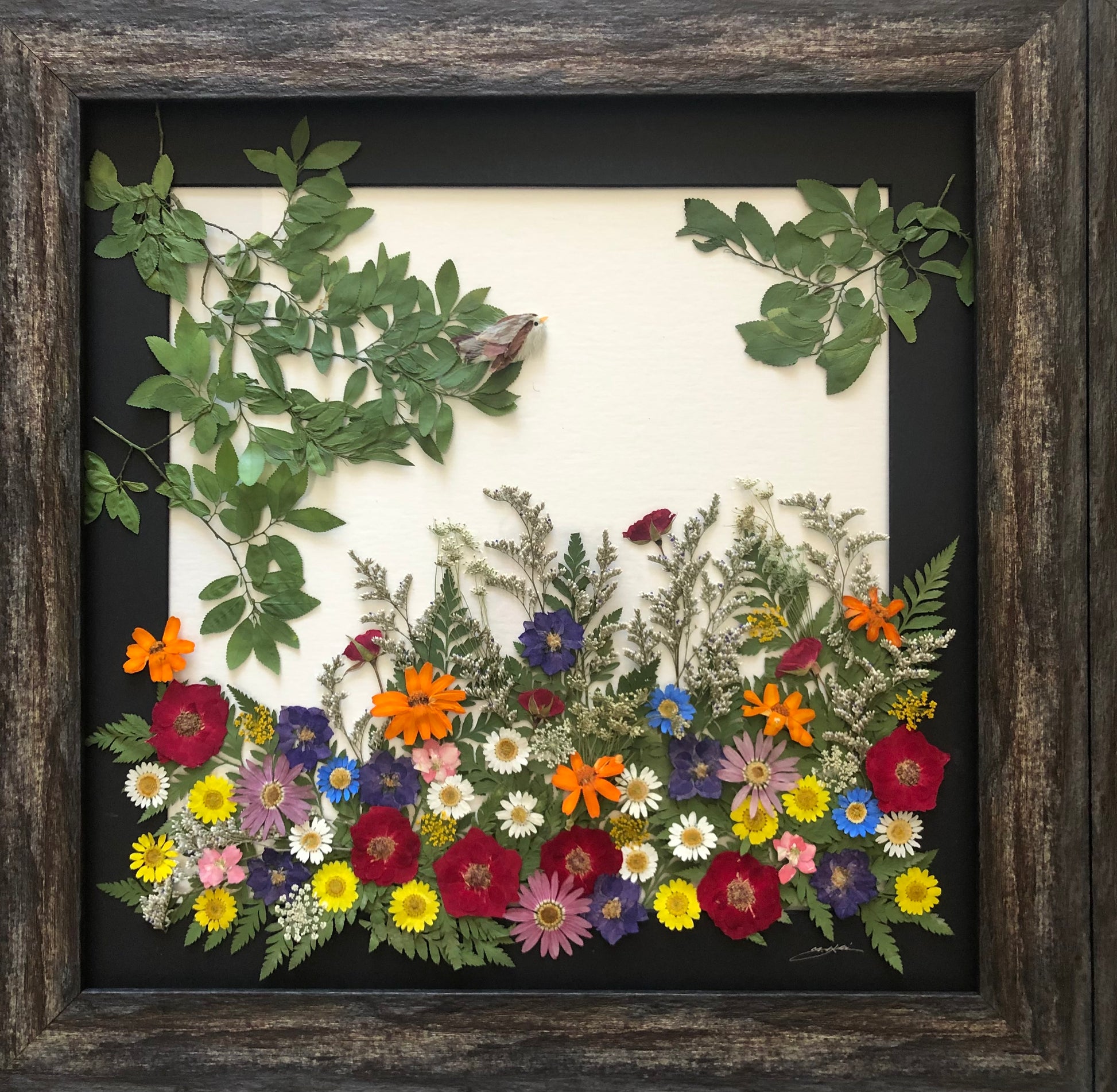 The pressed floral design measures 9 inches, and is professionally framed to a total finished size of 13 x 13 inches, creating a balanced presentation that’s ready to display. The frame features double glass presentation that enhances the artwork while allowing the delicate details of the pressed flowers to remain the focal point.
