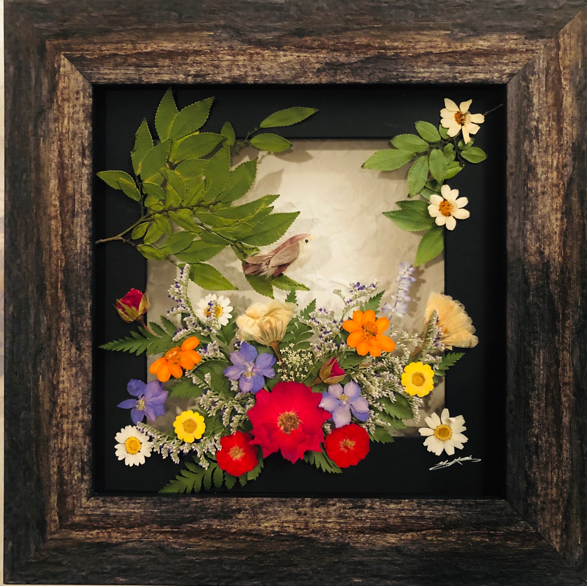 The pressed floral design measures 9 inches, and is professionally framed to a total finished size of 13 x 13 inches, creating a balanced presentation that’s ready to display. The frame features double glass presentation that enhances the artwork while allowing the delicate details of the pressed flowers to remain the focal point.